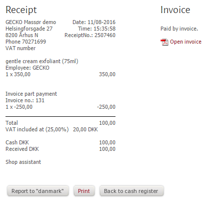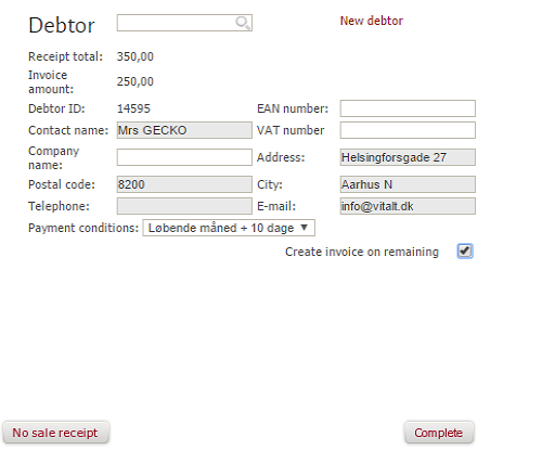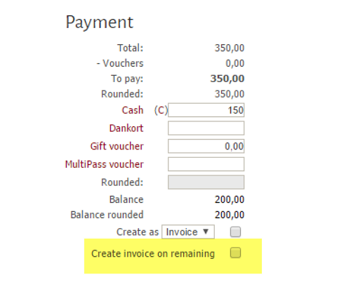 Her kan kunden så f. eks vælge at betale 100 kroner kontant ud af 350 kroner og oprette en faktura på det resterede beløb.